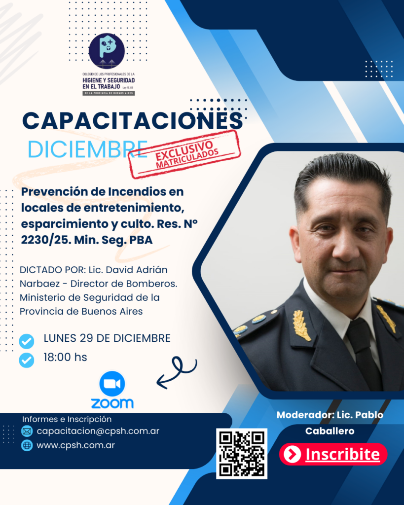 El Colegio de Profesionales de Higiene y Seguridad en el… Leer más: EL CPSH BS AS INAUGURÓ SU SEDE ZÁRATE Y FORTALECE LA PRESENCIA TERRITORIAL EN LA REGIÓN - Capacitación: Prevención de incendios en locales de entretenimiento, esparcimiento y culto. Res. Nº 2230/25. Min. Seguridad PBA