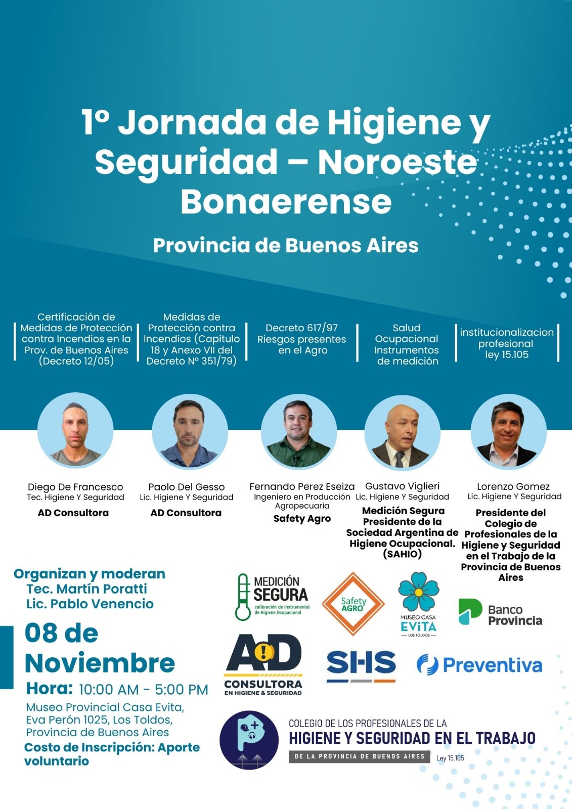 El Colegio de Profesionales de la Higiene y Seguridad en el Trabajo de la Provincia de Buenos Aires invita a participar de la Primera Jornada de Higiene y Seguridad – Región Noroeste Bonaerense, que se llevará a cabo el viernes 8 de noviembre, de 10:00 a 17:00 horas, en el Museo Provincial Casa Evita (Eva Perón 1025, Los Toldos).