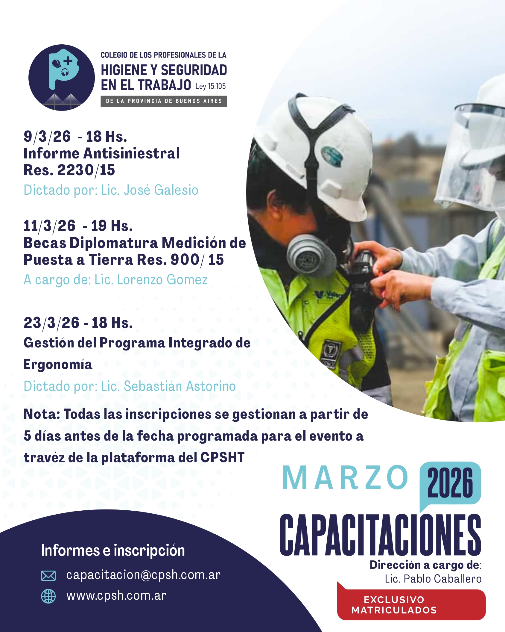 El Colegio de los Profesionales de la Higiene y Seguridad en el Trabajo de la Provincia de Buenos Aires (CPSH – Ley 15.105) informa el cronograma de capacitaciones previstas para el mes de marzo de 2026, destinadas exclusivamente a profesionales matriculados.